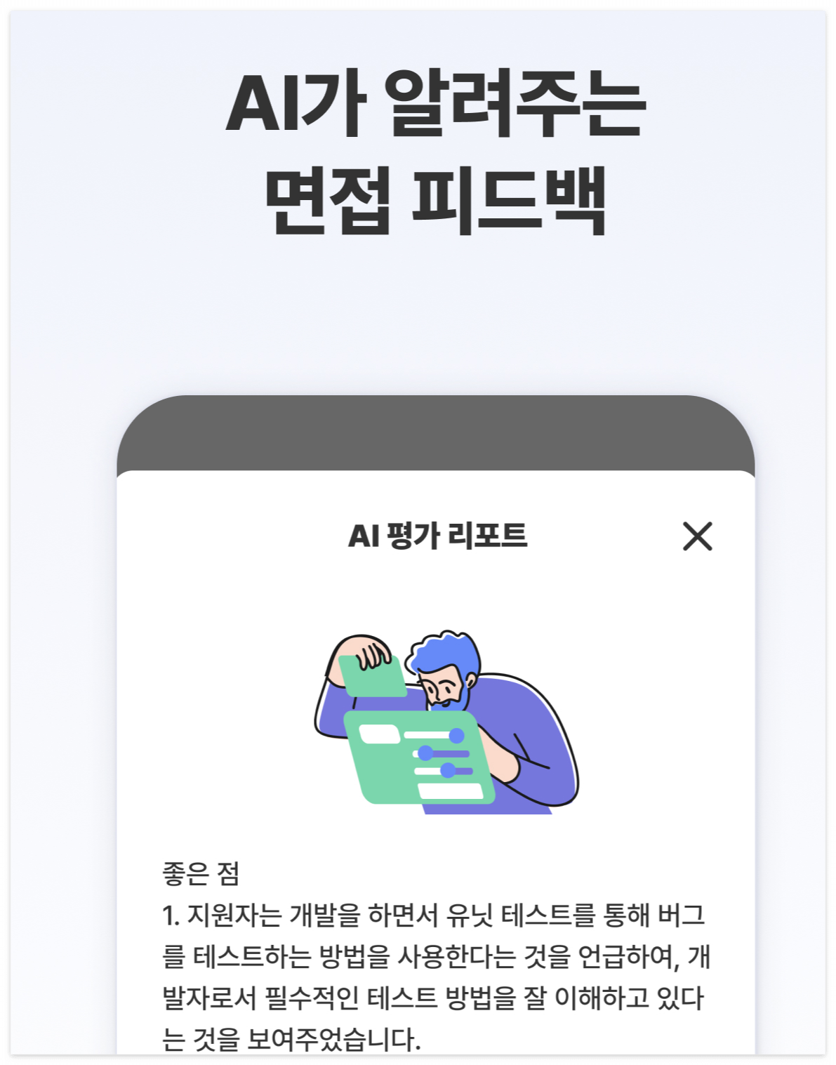 버그를 테스트하고 해결하는 방법을 설명해달라는 질문에 대답을 하면서 어떻게 테스트하는지만 이야기하고 해결하는 과정을 빠트렸는데 AI평가리포트의 개선해야할 점에서 바로 그 부분을 짚어줘서 면접의 대답을 점점 더 정교화하는데 도움이 될 것 같습니다.