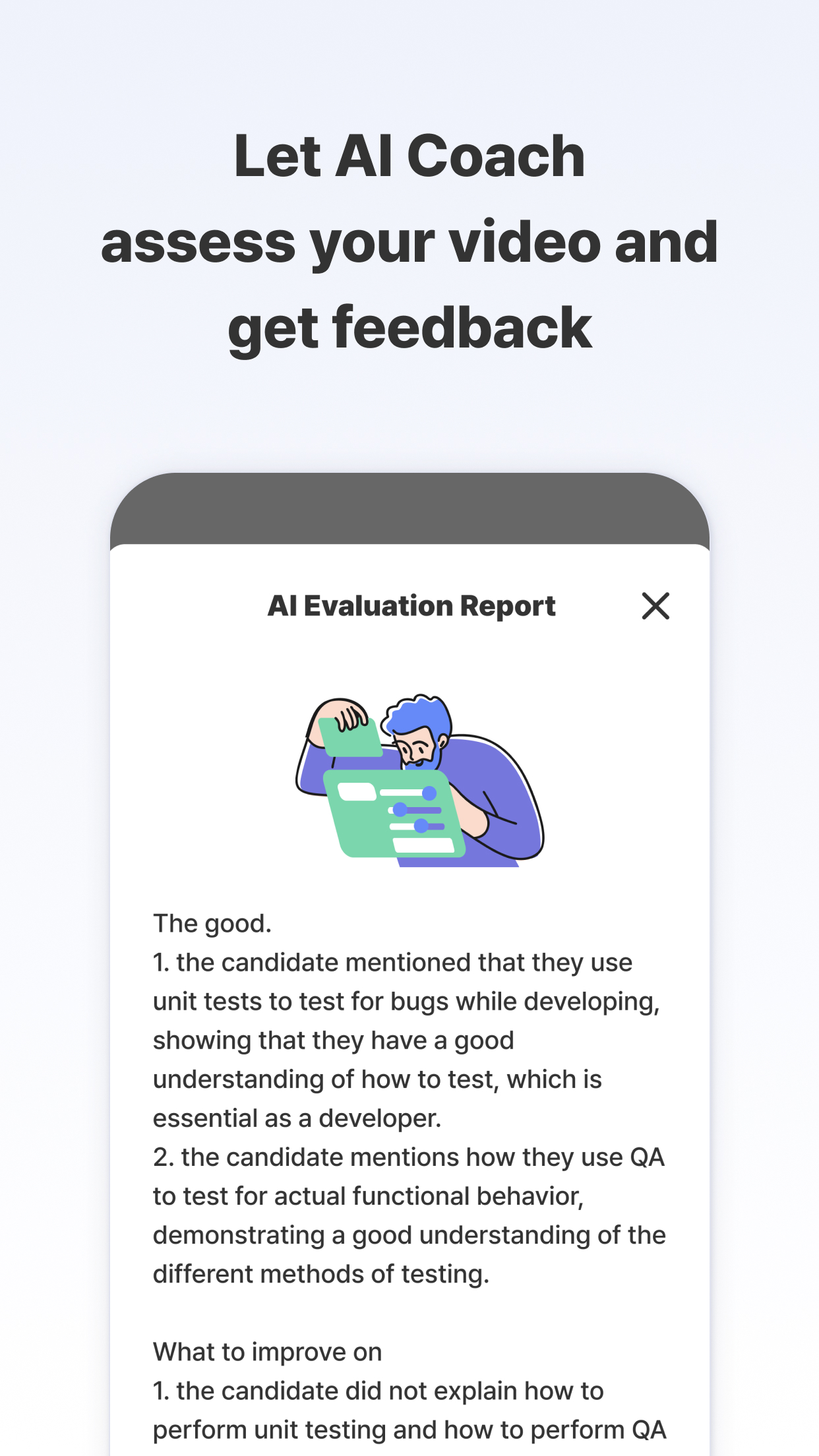After completing the interview practice, you can review your performance. The app offers an AI review that analyzes your responses and provides feedback on areas of improvement as well as positive aspects. For instance, if you missed explaining the process of testing and resolving bugs in response to a question, the AI review would highlight that aspect for you to work on, helping you refine your answers over time.